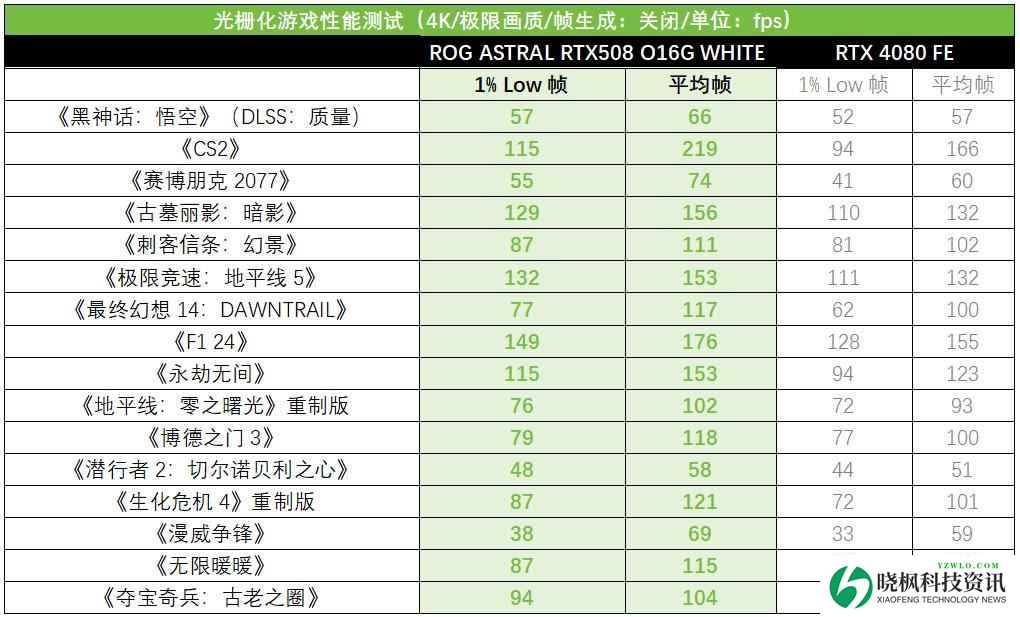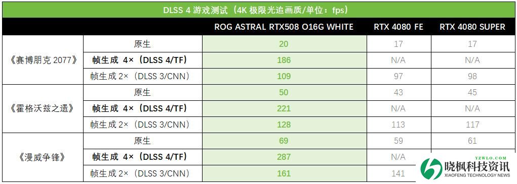 综合DLSS 4游戏测试的成绩来看,ROG ASTRAL白夜神RTX 5080 配合DLSS 4的确能够带来巨大的性能飞跃。测试三款游戏在DLSS 4的加持下,其帧率都可以达到原生分辨率的4倍以上,《赛博朋克2077》更是达到原生分辨率的9.3倍,堪称“黑科技”级别的提升。