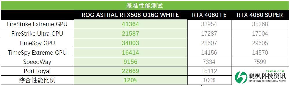 3DMark GPU基准性能测试部分,可以看到相比RTX 4080,ROG ASTRAL白夜神RTX 5080在DX11的FireStrike测试中,平均领先RTX 4080 23%,在DX12的TimeSpy系列中则提升17%,而在SpeedWay和Port Royal中则提升了25%。ROG ASTRAL白夜神RTX 5080相比RTX 4080 SUPER的提升也是比较明显的,其中FireStrike测试中领先19%、TimeSpy中领先14%、SpeedWay和Port Royal中提升了21%。综合来看,ROG ASTRAL白夜神RTX 5080比RTX 4080提升了22%,相对RTX 4080 SUPER平均提升了18%。