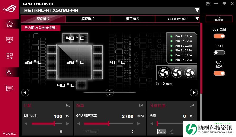 用料部分,ROG ASTRAL白夜神RTX 5080配备了50A晶体管和16+4+3相供电,可以提供比标准规格高出35%的功率支持,大幅增强供电稳定性和超频潜力。显卡还使用了保护性电路涂层,采用全自动化制程,有效提升了显卡的可靠性和耐用度。因此,它的整板功率上限高达400W,相比公版的360W规格更高,GPU频率也提升到了2760 MHz,高于公版的2620 MHz。