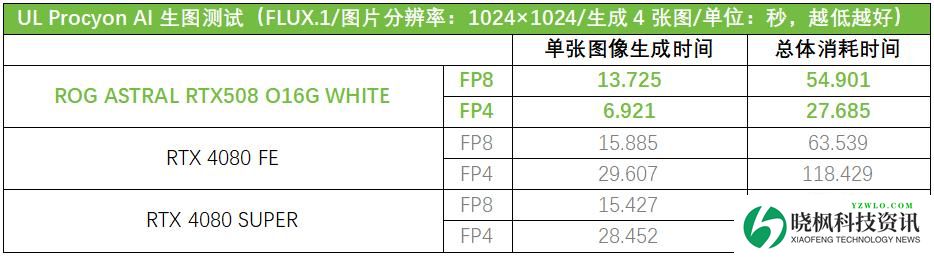 AI性能方面,从测试可以看到,ROG ASTRAL白夜神RTX 5080在FP4模式下相对FP8模式出图速度大约快了一倍,而RTX 4080和RTX 4080 SUPER由于不支持FP4模式,在FP4模式下的出图效率几乎相比FP8模式慢了一半,更是只有ROG ASTRAL白夜神RTX 5080在FP4模式下的23%~24%。有AI应用和AIGC创作需求的用户,使用ROG ASTRAL白夜神RTX 5080能够带来更高的效率提升。