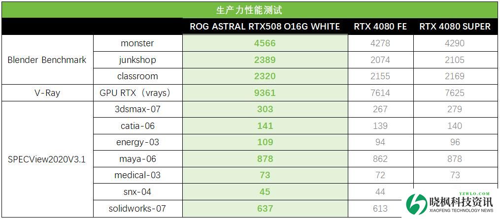 生产力性能方面,ROG ASTRAL白夜神RTX 5080最高领先RTX 4080和RTX 4080 SUPER大约23%,平均领先幅度分别为8%和7%。另外,ROG ASTRAL白夜神RTX 5080除了具备16GB GDDR7大显存和双视频编解码器之外,未来的3D设计软件还会增加对DLSS 4的支持,那么在实时预览的时候RTX 5080白夜神的优势会更大。对于生产力用户来说,ROG ASTRAL白夜神RTX 5080无疑是提升工作效率的最佳选择。