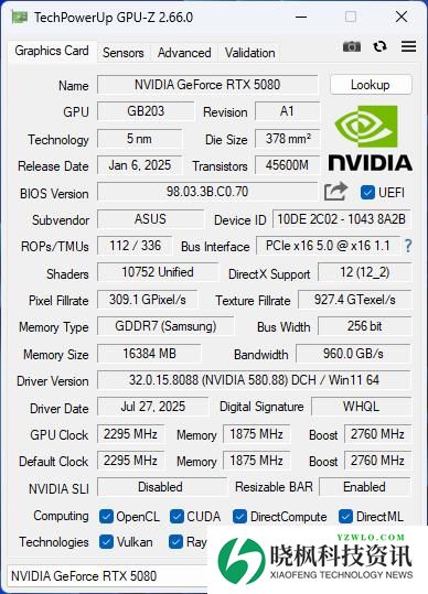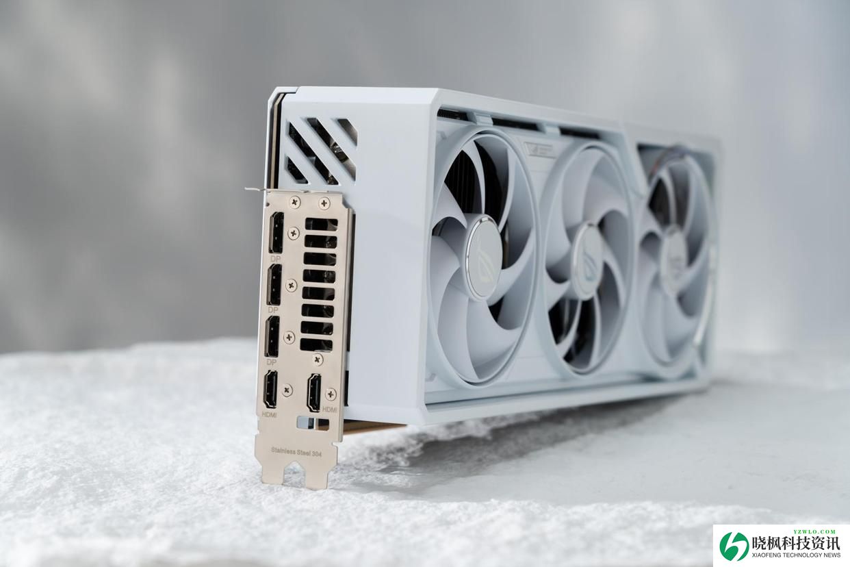 显卡的尺寸为长357.6mm,高149.3mm,厚76mm,厚度达到了3.8槽,重量更是超过2.8kg,尺寸和重量都相当可观,玩家在挑选机箱的时候需要特别注意一下尺寸问题。ROG ASTRAL白夜神RTX 5080之所如此“重量级”,是因为其采用了高质量的压铸金属框架、护盖和背板,还使用了304不锈钢的I/O挡板,这些都很好地保护了显卡PCB,提升了显卡的稳定性。