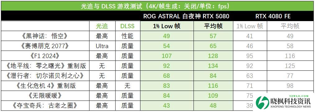接下来是实际的游戏测试,首先是传统的光栅化游戏。在4K分辨率下,ROG ASTRAL白夜神RTX 5080的游戏性能相比RTX 4080平均领先幅度达到了16%,部分游戏中的提升达到20%以上。RTX 4080运行《黑神话:悟空》《漫威争锋》时不到60fps,ROG ASTRAL白夜神RTX 5080则可以跑到60fps以上的流畅帧率。1%Low帧部分,ROG ASTRAL白夜神RTX 5080相比RTX 4080平均提升了大约17%,提升幅度还是相当可观。