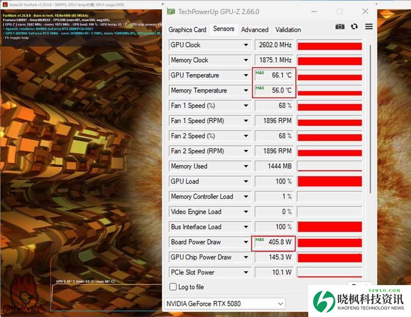 在功耗与温度测试部分,我们在25℃的测试环境中,使用Furmark连续考机30分钟。默认考机功率最高可以达到405W,得益于ROG ASTRAL白夜神RTX 5080强悍的散热配置,GPU温度最高66℃,显存温度最高为56℃,温度表现出色。此时风扇的转速保持在1900RPM左右,没有明显的风噪声。
